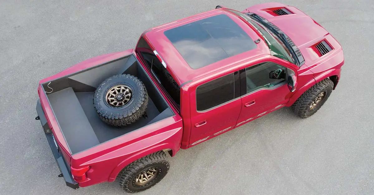 The idea is quite simple. We have put our chassis engineering skills to work to design a super strong off-road capable tubular steel frame that replaces the Ford F-150 ladder frame. Attached to that chassis is a custom off-road long-travel suspension. We keep the awesome F-150 aluminum cab, but give you an all-new front suspension with massive Fox shocks and tubular control arms, hood, fenders, rear quarter panels, rear 4-link suspension with tubular control arms and remote reservoir Fox shocks, aluminum truck bed, tailgate, and bumpers.