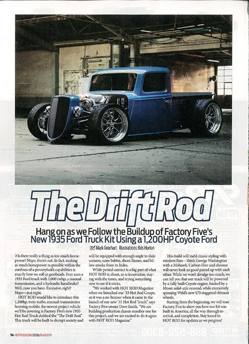 Hot Rod Magazine's Drift Rod Build Series - Writer Mark Gearhart has worked on several Factory Five builds previously including his Ultimate Challenge Car project. Mark has started a new build series documenting a 1,000+ HP Hot Rod Truck. Check out all of his updates here.