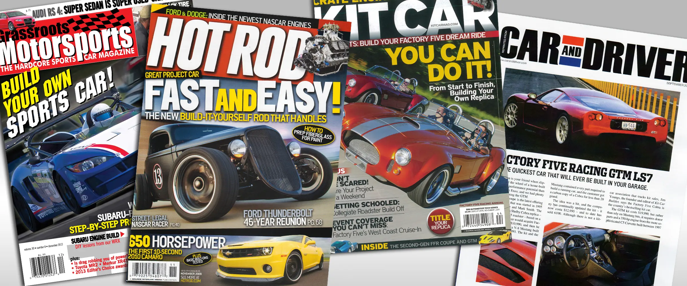Factory Five has been featured in a number of magazine articles and TV shows. Below, you'll find links to those articles in digital form as well as links for you to watch the shows we have been on.
